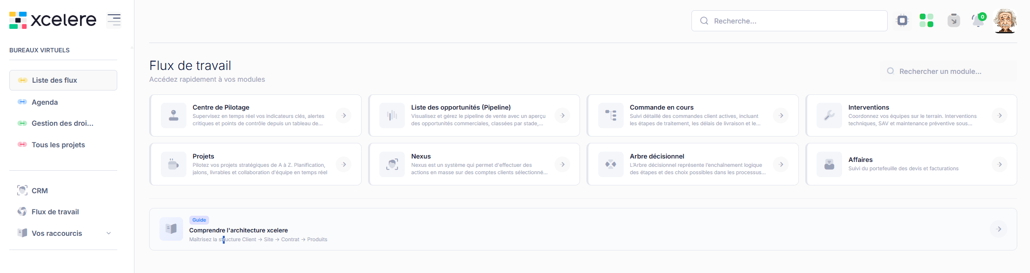 xcelere réunit CRM, ERP et outils métiers dans une plateforme unifiée. Chaque module communique nativement avec les autres.
