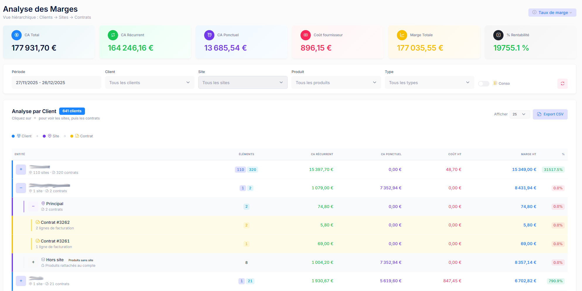 Une structure hiérarchique claire : Clients, Sites, Contrats, Produits. Naviguez dans votre organisation comme dans des poupées russes.